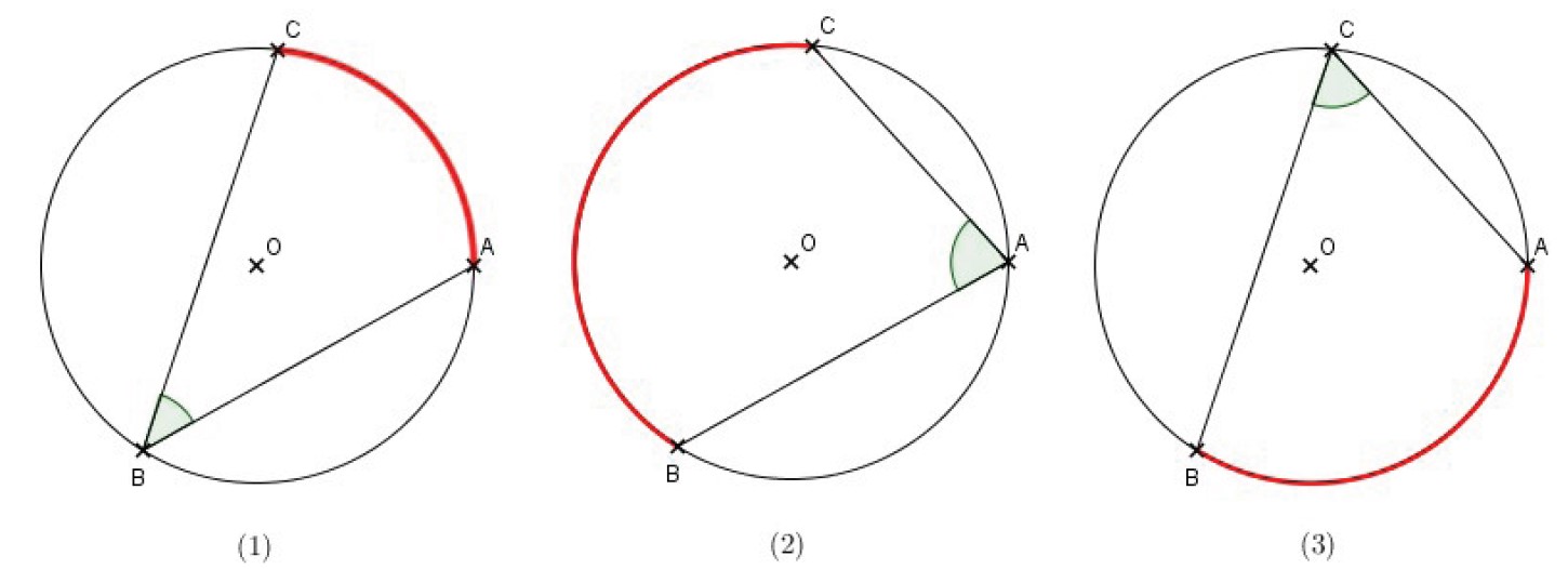 | Angle au centre vs inscrit | $\widehat{AOB} = 2 \times \widehat{ACB}$ |