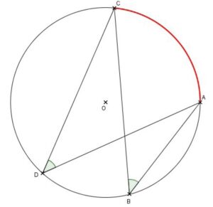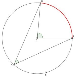 L’angle inscrit $\widehat{CDA}$ intercepte le même arc de cercle $\stackrel{\frown}{AC}$ que l’angle au centre $\widehat{COA}$ ,donc nous avons $\widehat{COA}=2 \times \widehat{CDA}$.