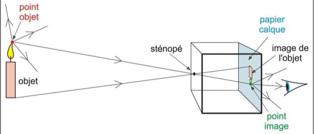 La chambre noire est une boîte opaque dont une face est translucide (papier calque) qui joue le rôle d’un écran et dont la face opposée est percée d’un petit trou appelé sténopé.
