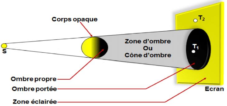 - Sur le corps éclairé, on distingue une région éclairée située face à la source lumineuse et une région qui ne reçoit pas de lumière, appelée ombre propre.