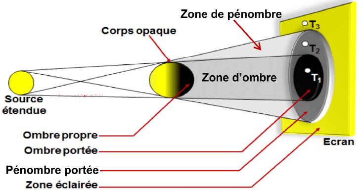 - Sur l’écran, on distingue trois régions : une région éclairée, une région d’ombre complète appelée ombre portée, et une région intermédiaire appelée pénombre portée.