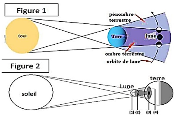 Observation : La Lune devient invisible ou prend une teinte rougeâtre selon qu’elle est dans l’ombre ou la pénombre. Ce phénomène ne peut se produire que lors de la pleine lune.
