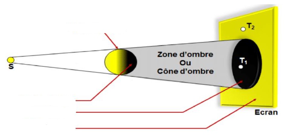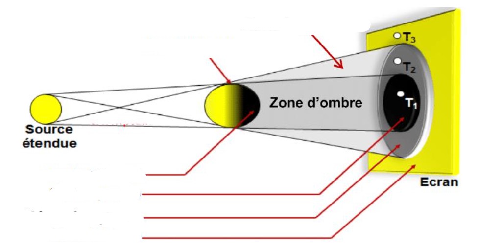 Avec une source lumineuse étendue, on distingue sur l’écran trois régions : une région éclairée, une ombre portée et une pénombre portée.