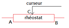 Rhéostat : résistance variable à trois bornes A, B et C. \(R_{AB}\) est la résistance totale ; si on déplace le curseur C de A vers B, la résistance utilisée est \(R_{CB}\).