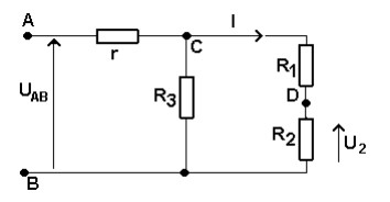 \(r = 50\ \Omega \quad ; \quad R_1 = R_2 = R_3 = 100\ \Omega \quad ; \quad U_{AB} = 10\ V\)