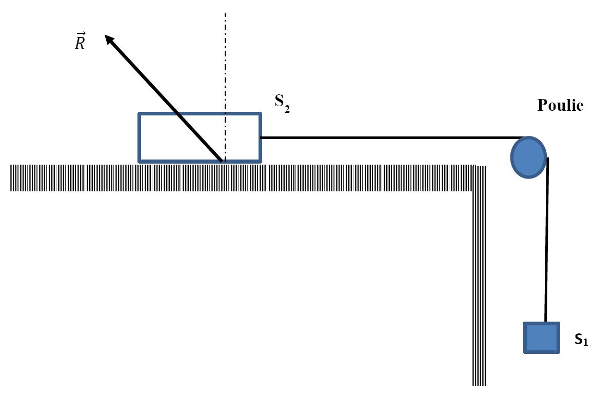 Le schéma de la figure ci-dessous représente un dispositif en équilibre formé de deux corps \( S_1 \) et \( S_2 \) reliés par un fil passant par une poulie.