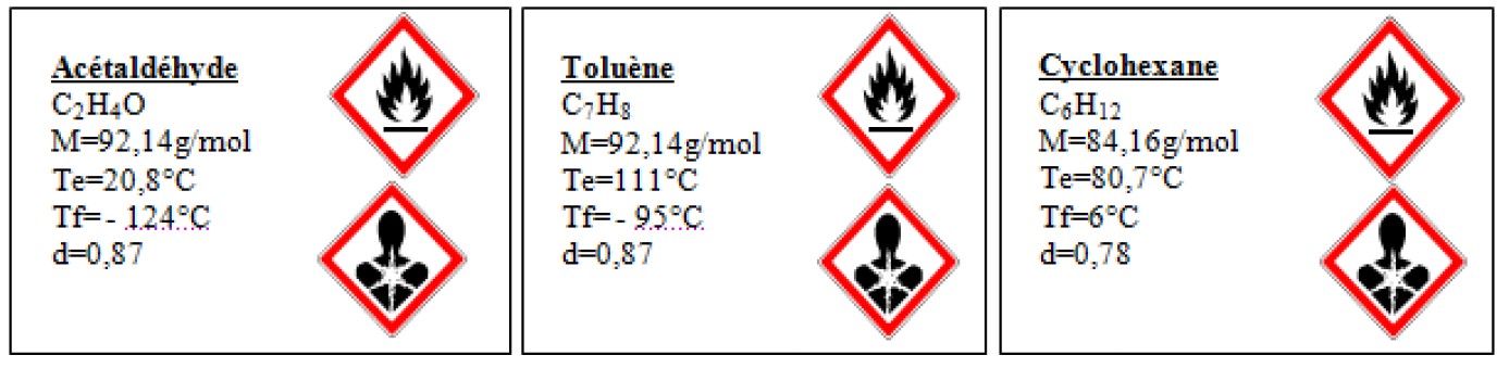 Un jeune chimiste débutant doit replacer les étiquettes ci-dessous décollées de flacons contenant des liquides incolores : l’acétaldéhyde, le cyclohexane et le toluène.