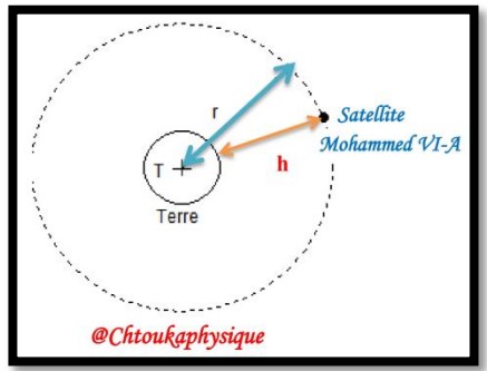 Le satellite Mohammed VI-A de masse \( m_A = 970 \, \text{kg} \), considéré comme ponctuel par rapport à la Terre décrit une trajectoire circulaire de rayon \( r \) dont le centre est celui de la Terre. Le satellite (\( A \)) se trouve à une hauteur \( h = 695 \, \text{Km} \) de la surface de la terre.