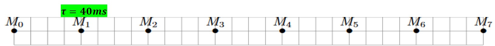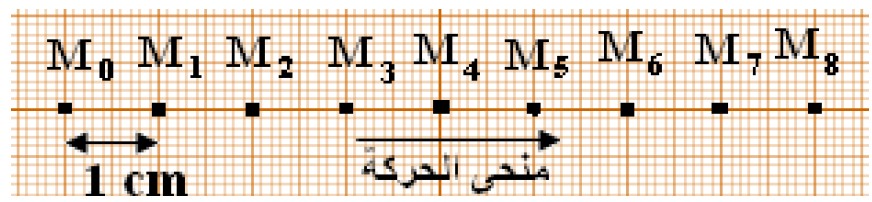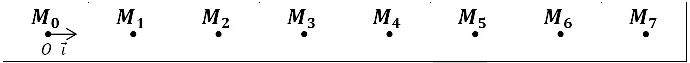 Dans une séance de travaux pratique, on désire étudier le mouvement d’un cavalier qui se déplace sur un banc à coussin d’air, on lance le cavalier sur le banc. Et avec un système enregistreur, on visualise les positions successives d’un point M du cavalier. La figure suivante représente ce mouvement à intervalles de temps consécutifs et égaux \( \tau = 40 \, \text{ms} \), avec une échelle \( \frac{1}{2} \):