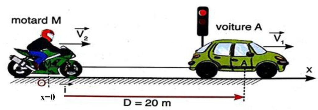 À l’instant qu’on choisit comme origine des temps (t=0) la voiture grille un feu rouge et le motard la suit, la distance qui les sépare en ce moment est \( D = 20 \, \text{m} \).