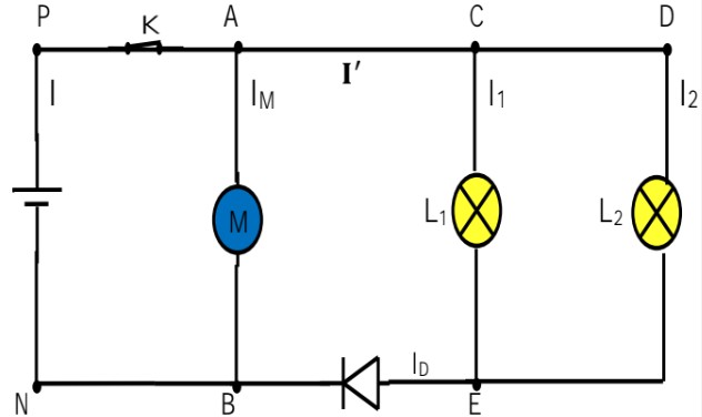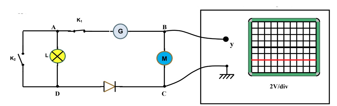 On considère le circuit électrique suivant constitué d’un générateur G, une lampe L, un moteur M, une diode et deux interrupteurs \( K_1 \) et \( K_2 \).