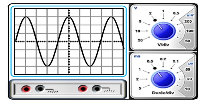 Pour visualiser une tension variable sur l’oscilloscope, on branche la borne rouge du GBF (générateur basse fréquence) avec son entrée Y₁, et la borne noire du GBF avec sa masse. L’oscillogramme obtenu est représenté ci-dessous.