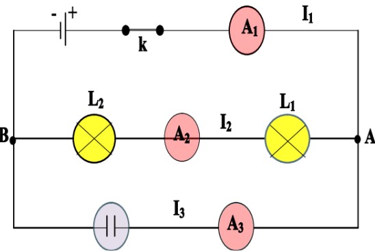 c) Sachant que l’ampèremètre \(A_1\) indique la valeur \(I_1 = 150\,\text{mA}\) et que \(I_2 = 100\,\text{mA}\). Déterminer les intensités de courant \(I\) (les deux lampes sont identiques) et \(I_3\).