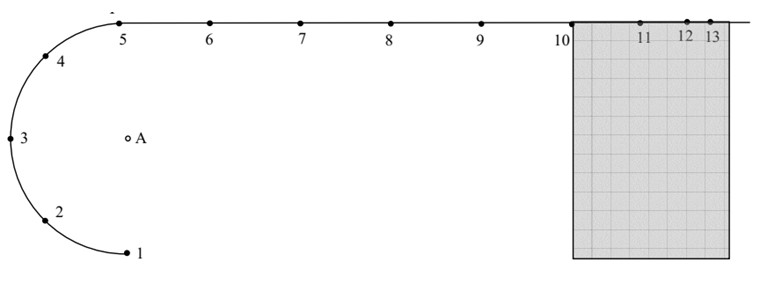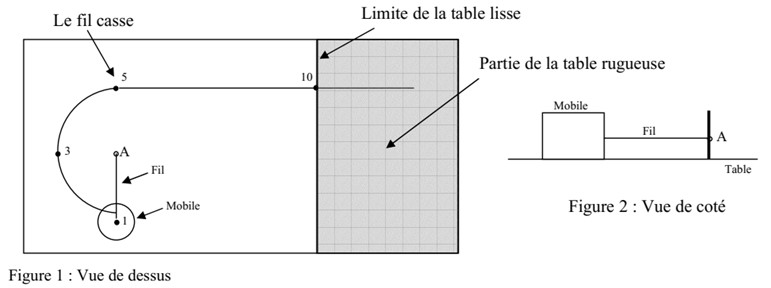 Un mobile est en mouvement sur une table parfaitement lisse. Il est attaché à un point central A par un fil. On supposera qu’il évolue sans frottements sur cette table. Le mobile de masse \( m = 250 \, \text{g} \) est initialement en position (1). Il est attaché à un fil puis lancé. Il n’a pas le temps d’effectuer un tour complet : Le fil casse en position (5). Le mouvement du mobile est alors modifié, il se dirige vers une partie de la table rugueuse.