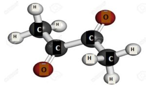 Voici le modèle moléculaire de la molécule de 2,3-butanedione (responsable du goût de beurre) :