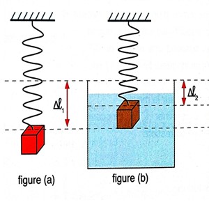 On trempe totalement la masse dans un liquide. L’allongement du ressort devient alors \( \Delta l_2 = 8 \, \text{cm} \) (figure b).