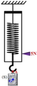 5) La figure 1 (ci-dessous) représente le dispositif expérimental utilisé par Ahmed. On considère que le corps solide (S) est en équilibre sous l’action de son poids \( \vec{P} \) et la force \( \vec{T} \) associée à l’action du dynamomètre. On donne \( g = 10 \, N/kg \).
