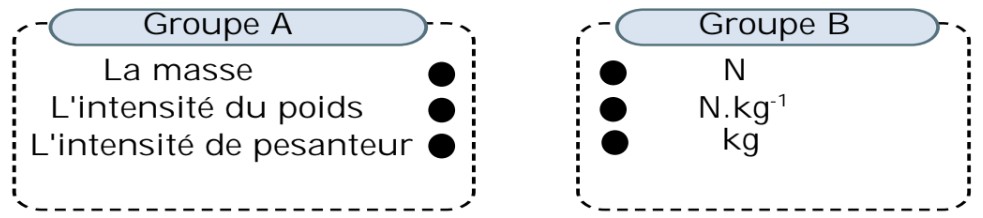 b- La masse d’un solide (S) dont l’intensité du poids est P = 4 N. ………………………….. kg