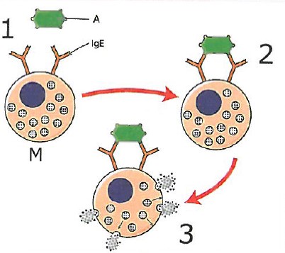 - Fixation de l’allergène sur les anticorps IgE déjà présents sur les mastocytes