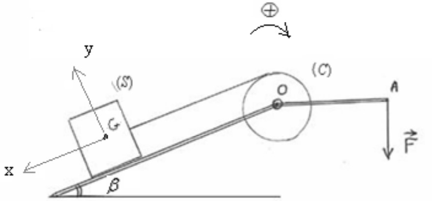 - d’un solide (S) de masse m = 0,5 kg posé sur un plan incliné d’un angle \( \beta = 30^\circ \) par rapport à l’horizontal