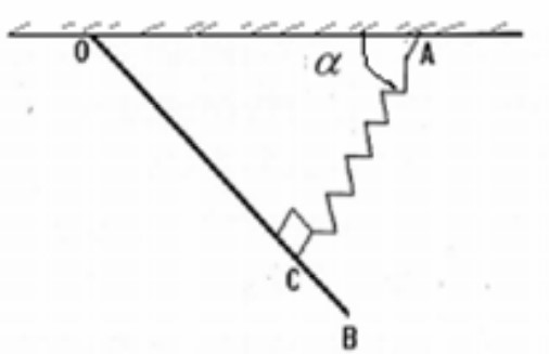 Une barre AB homogène de masse m = 5 kg, accrochée au plafond horizontal d’un bâtiment, est articulée autour d’un axe horizontal A passant par son extrémité O. Elle est maintenue en équilibre à l’aide d’un ressort comme l’indique la figure.