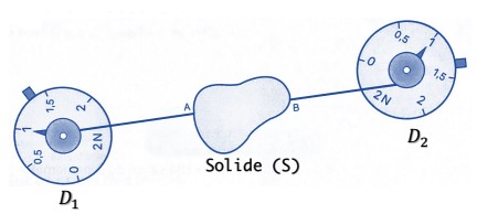 1.1 On considère un corps (S) en équilibre soumis à l’action de deux dynamomètres.