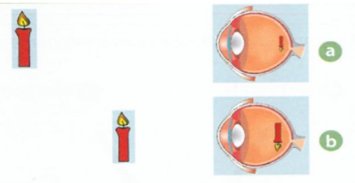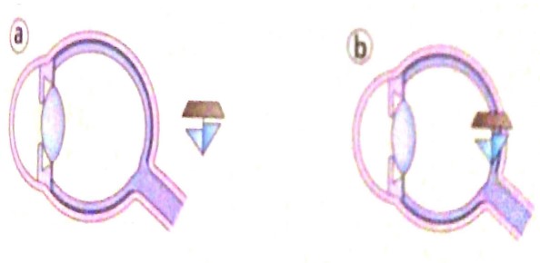 Le schéma ci-contre représente un œil qui observe un bateau éloigné sans accommoder (a), puis le même œil observant le même objet après avoir accommodé (b).