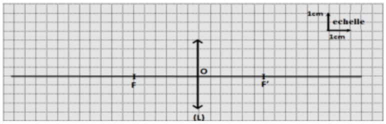 Compléter la construction géométrique de l’image A’B’ sur la figure ci-dessus (trajectoire des rayons lumineux).