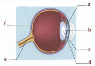 Observe le schéma simplifié de l’œil ci-dessous. Associe à chaque lettre (a, b, c, d, e, f) la légende qui convient, choisie parmi les mots suivants :