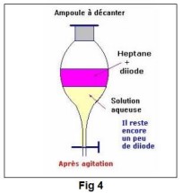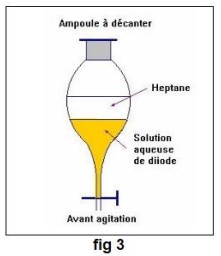 - On introduit le mélange d’une solution aqueuse d’iodure de potassium et de diode dans l’ampoule à décanter.