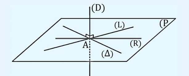 Soit \( (P) \) un plan, et soient \( (L) \), \( (\Delta) \), \( (R) \) trois droites de ce plan. Soit \( (D) \) une droite perpendiculaire à \( (L) \) et \( (\Delta) \) en un point \( A \) de \( (P) \).