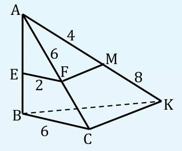 Données : \( AF = 6 \), \( EF = 2 \), \( BC = 6 \), \( AM = 4 \), \( AK = 12 \)