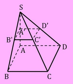 On a réduit la pyramide \( SABCD \) et on a obtenu une pyramide \( SA’B’C’D’ \) dont l’aire de sa base \( A’B’C’D’ \) est égale à \( 3 \, cm^2 \).