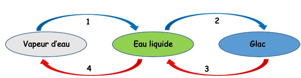 | Transformation | 1 (Fusion) | 2 (Vaporisation) | 3 (Liquéfaction) | 4 (Solidification) |