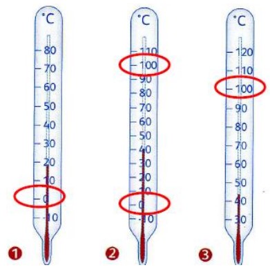2)$ Quelle est la température indiquée dans chaque thermomètre ?