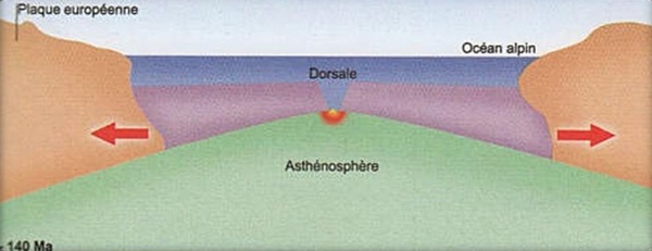 La croûte océanique relativement lourde de la Téthys (Mer située entre l’Eurasie et l’Afrique durant les ères secondaires et tertiaires) s’enfonça dans les profondeurs de la terre jusqu’à la collision de l’Europe et de l’Afrique.