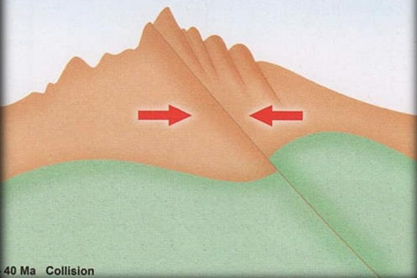 Les énormes forces de pression qui résultent de ce choc provoquent un gigantesque soulèvement montagneux.