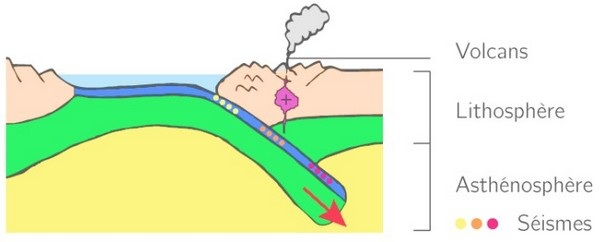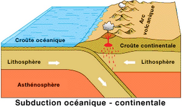 Lorsqu’une plaque océanique, plus dense, plonge sous la croûte continentale, on parle de « subduction océanique-continentale ».