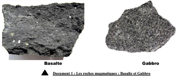 Le basalte et le gabbro sont parmi les roches magmatiques qui constituent la structure de la croute océanique. Une partie du magma subi un refroidissement lente au profondeur pour donner des roches de gabbro à texture grenu, le reste du magma remonte en surface et se refroidi progressivement et donne des roches basaltiques à texture microlitique (doc 4).
