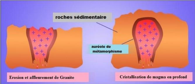 Au cours de la remonté et la cristallisation du magma en profondeur, sa température élevée influence sur les roches adjacentes en changeant leur texture et leur composition minérale. C’est le métamorphisme de contact, qui apparaît sous forme d’une bande de roches métamorphiques entourant les blocs de granite intrusif appelée auréole de métamorphisme.