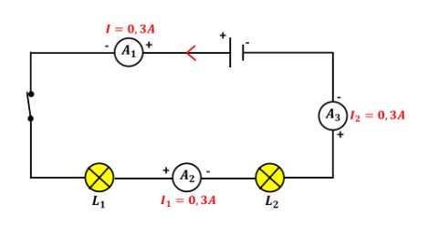 Les trois ampèremètres indiquent la même intensité \(I = I_1 = I_2\).