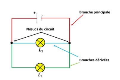 Dans un circuit en dérivation, l’intensité du courant de la branche principale est égale à la somme des intensités des courants dans les branches dérivées.
