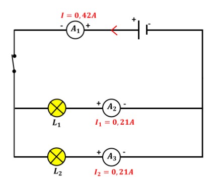 Les trois ampèremètres indiquent : \(I = 0,42\ A\) ; \(I_1 = 0,21\ A\) et \(I_2 = 0,21\ A\).