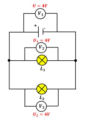 Les trois voltmètres indiquent la même valeur : \(U = U_1 = U_2\).