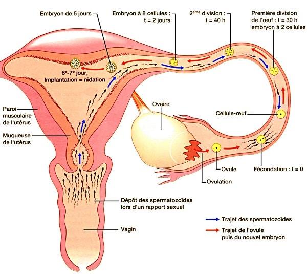 Après la fécondation, l’œuf migre vers l’utérus et subit plusieurs divisions (2 cellules, 4 cellules…). Après plusieurs divisions, on obtient l’embryon, qui s’implante dans la muqueuse utérine vers le 7ème jour : c’est la nidation.