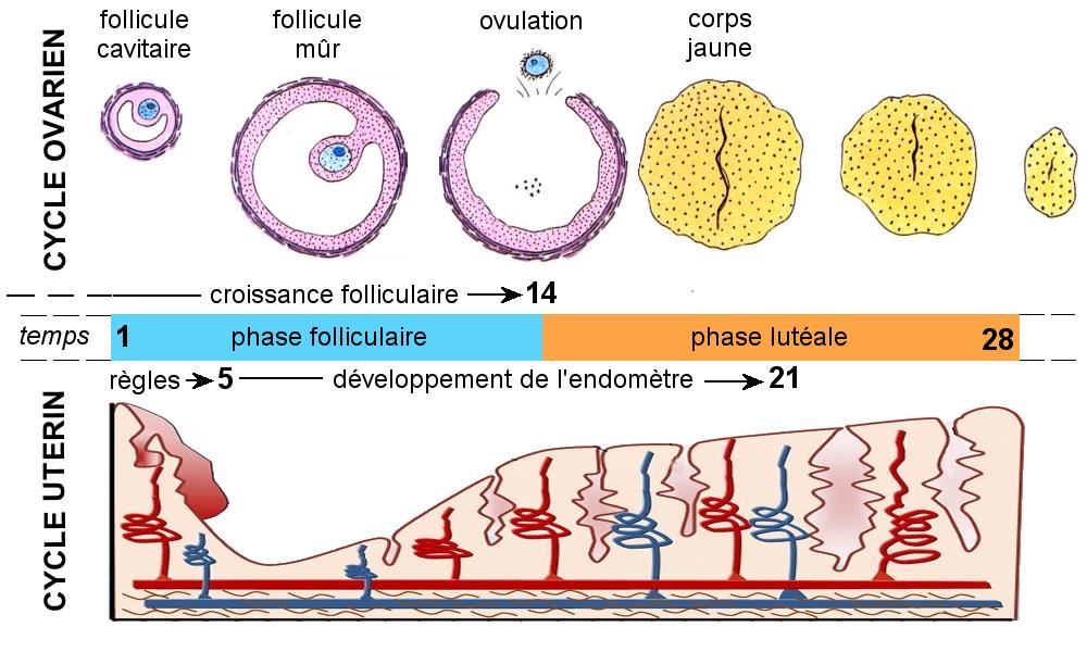 Chez une femme normale, le cycle menstruel dure 28 jours et commence par des règles qui durent environ 6 jours. Ce cycle est marqué par l’ovulation (libération de l’ovule par un follicule mature) qui a lieu au 14ème jour.