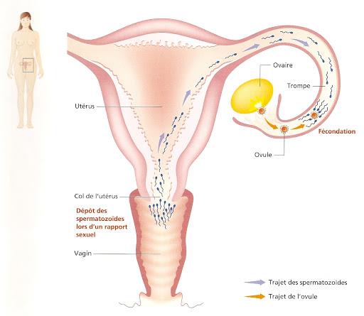 Lors d’un rapport sexuel, l’homme dépose les spermatozoïdes qui traversent le vagin, l’utérus et les trompes, et rencontrent l’ovule. Un seul gamète mâle pénètre dans le gamète femelle et assure sa fécondation.