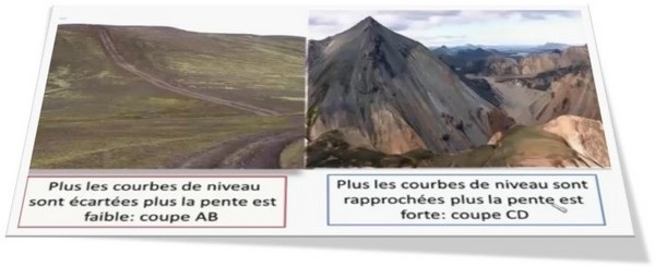 Distance horizontale qui sépare deux courbes de niveau. Permet d’estimer la pente : plus la pente est forte, plus les courbes sont rapprochées, et inversement.