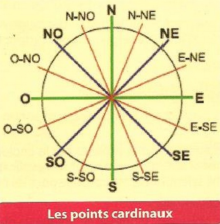 - Points intermédiaires : Nord-Est (NE), Sud-Est (SE), Sud-Ouest (SO), Nord-Ouest (NO)