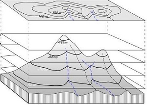 Pour comprendre la représentation du relief par les courbes de niveau, il suffit d’imaginer une montagne découpée en gradins.